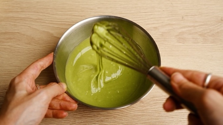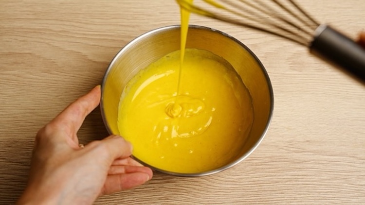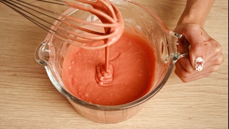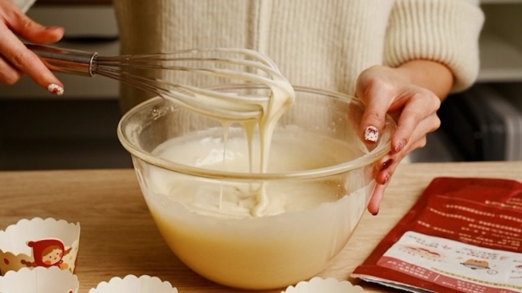 1.將焙日發糕粉:食用水:沙拉油依包裝背後食譜比例倒入碗中並攪拌均勻
