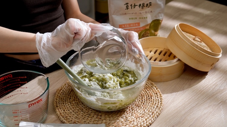 1.將草仔粿粉加入食用油並沖入90度熱水
