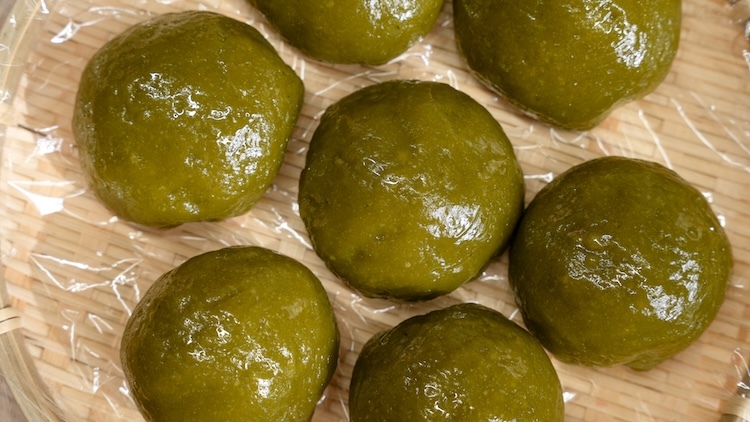 4.將備好的草仔粿團搓圓、壓平