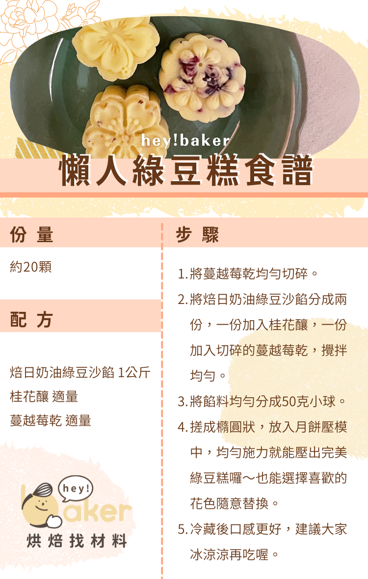 細緻清爽,加入烘焙界LV之稱的「19號發酵奶油」,可以直接放入月餅壓模製成綠豆糕