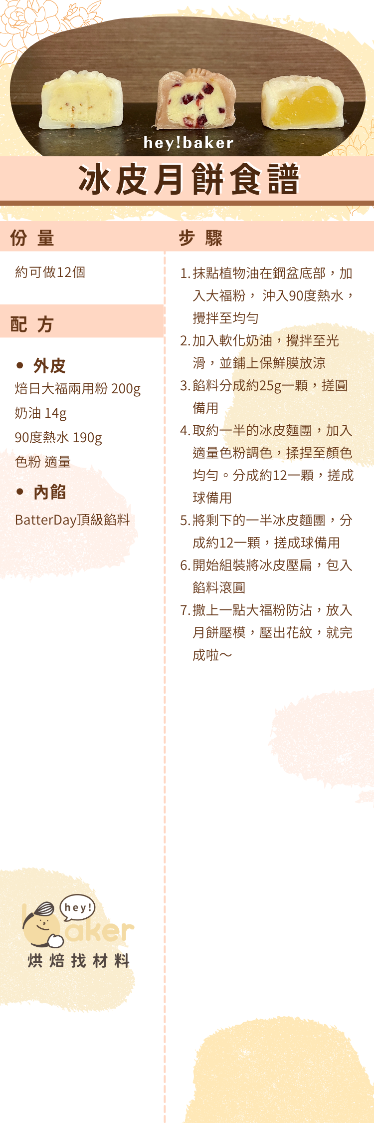 💡包入內餡的糖度、水分會影響冰皮的表現,成品一律建議儘速食用完畢。