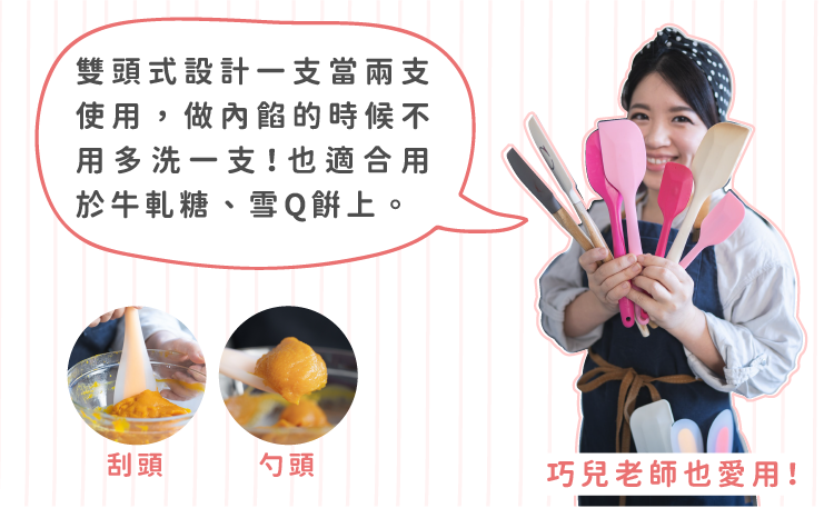矽膠材質,耐熱度高,耐柔韌性好,不易變形,堅固,可讓刮除更輕鬆。雙頭式設計一隻當兩隻使用。多用於牛軋糖、雪Q餅等製作。
