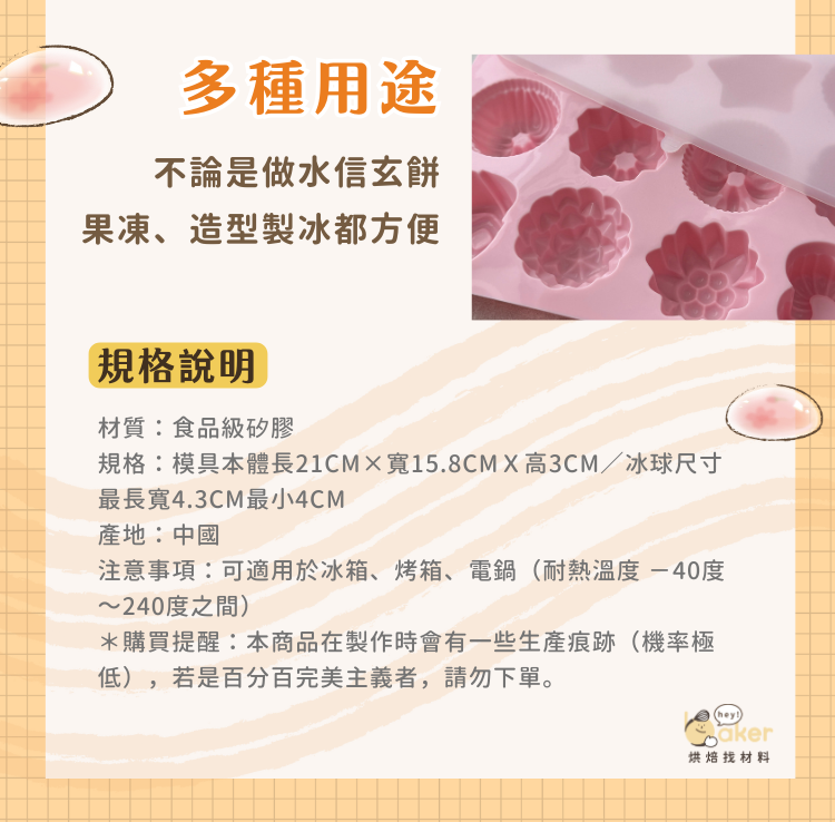 *小撇步:因本模具為矽膠軟膜,使用時可以下面放置一個沾板或烤盤,方便填入麵糊、液體後移動唷!