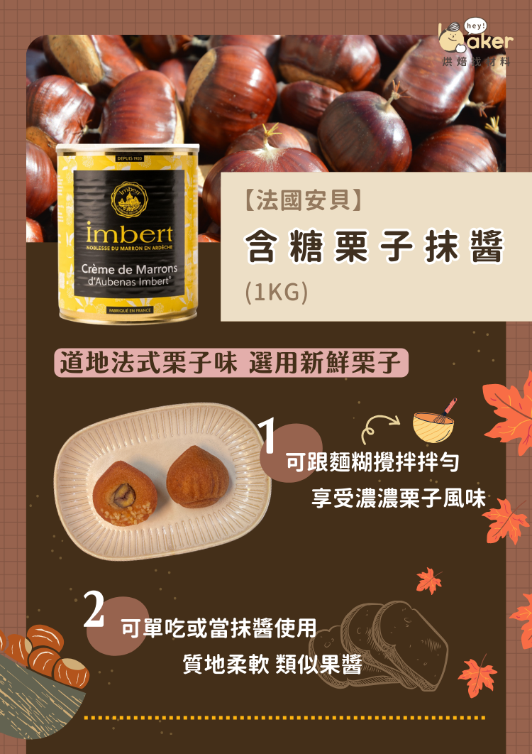 法國安貝Imbert®頂級栗子製品品牌,含糖栗子抹醬可以單吃或是跟麵糊攪拌,質地柔軟如果醬般,每一口都吃得到頂級栗子的法式風味~不添加任何防腐劑,天然吃得又安心!
