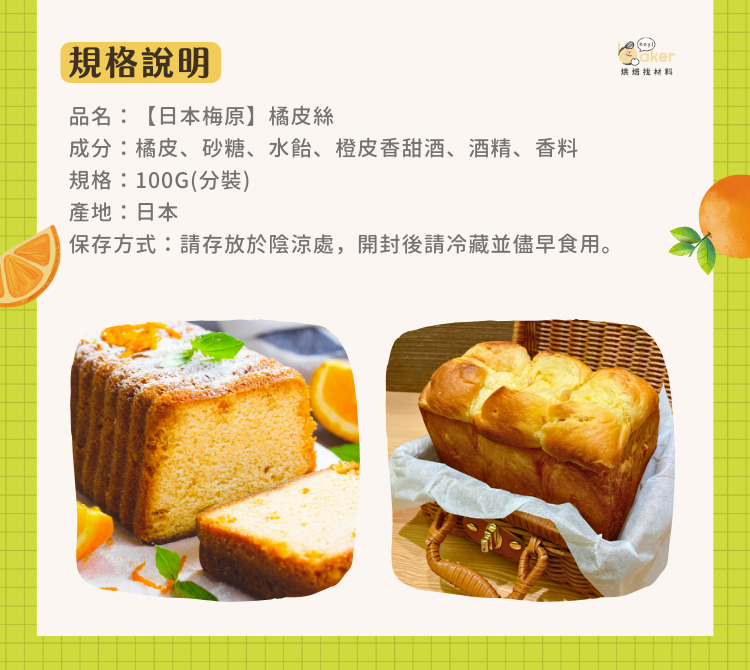 日本梅原選用100%天然水果,當季採收糖漬加工。橘子丁選自西班牙瓦倫西牙柑橘,不添加漂白劑、農藥、防腐劑、色素,1mm細絲大小入麵包西點好使用!