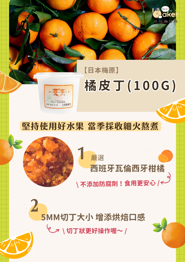 日本梅原選用100%天然水果,當季採收糖漬加工。橘子丁選自西班牙瓦倫西牙柑橘,不添加漂白劑、農藥、防腐劑、色素,5mm切丁大小入西點麵包超方便~