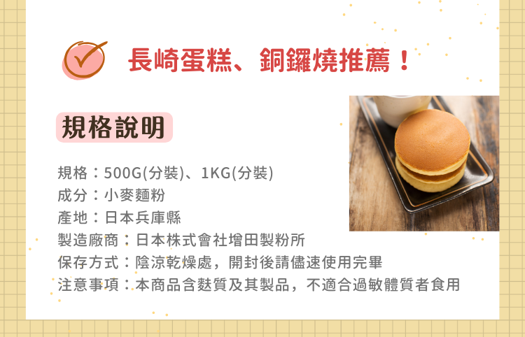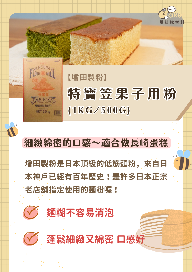 來自日本的頂級低筋麵粉,不易產生筋性,安定性及口感特佳~麵糊不易消泡,讓成品柔嫩,蓬鬆度更好!適合製作品項如長崎蛋糕、銅鑼燒、蛋糕捲、海綿蛋糕、瑪德蓮、餅乾等多種品項。創立於1908 年的日本老品牌<增田製粉>,獨家技術讓麵粉不易產生筋性,使成品更加蓬鬆美味,再烘焙界擁有極高的人氣。