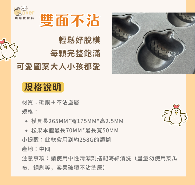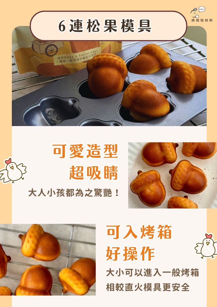 帶有秋天感的松果模具,大自然造型特別有氛圍感!6連模具可以一次出爐多個,不僅快速又方便~相比直火式模具可以入烤箱,操作更安心實用唷!不沾黏模具脫膜更輕鬆、成型更美觀!不論是大人或小孩都愛的夜市小吃,趕快動手來做吧!!!