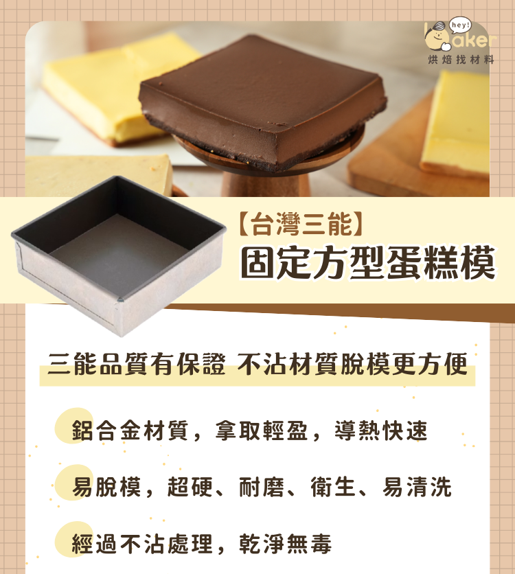 台灣三能固定方型蛋糕模,採用高強度鋁合金製成,具備優異的耐用性與穩定性,不易變形,導熱均勻快速,讓烘焙更高效,輕鬆烤出完美蛋糕!