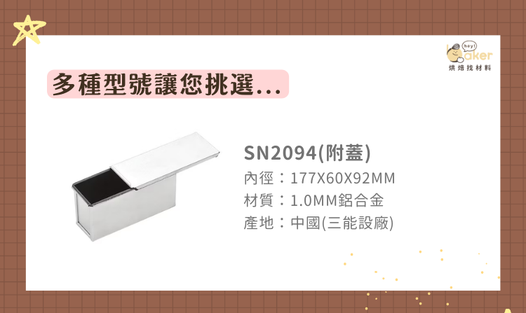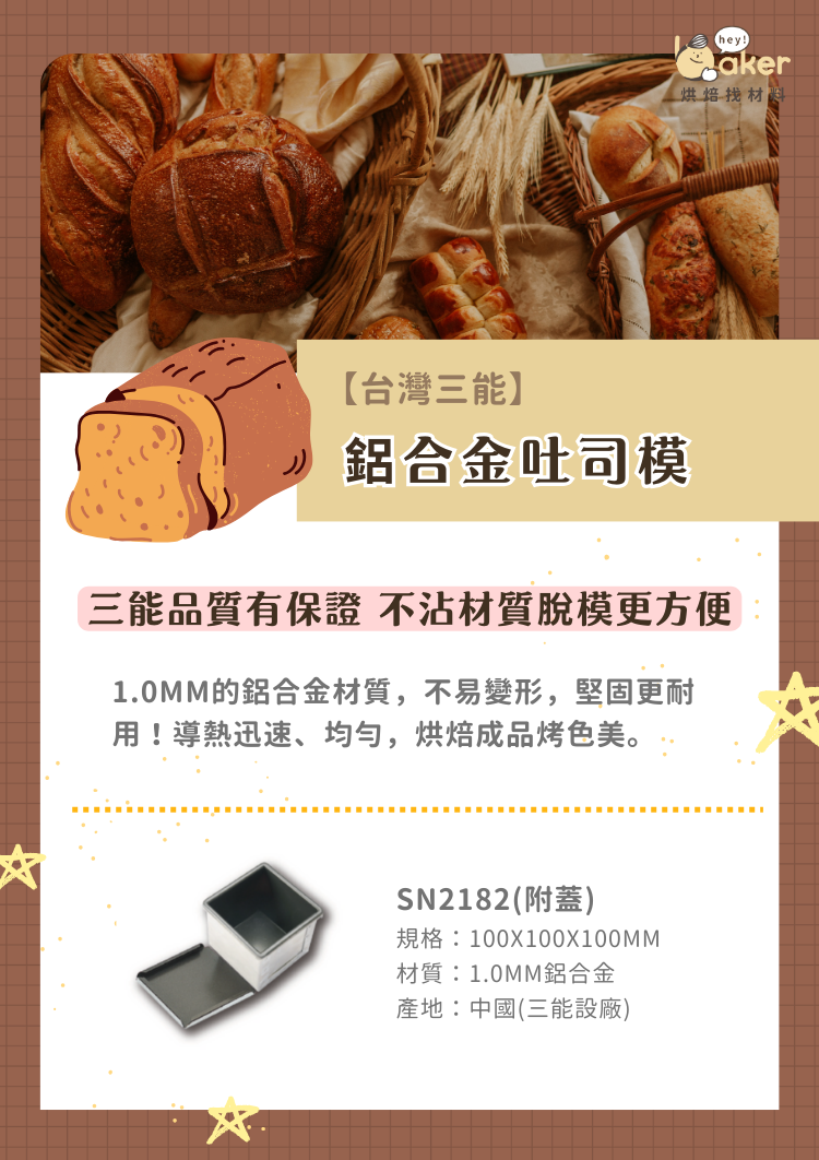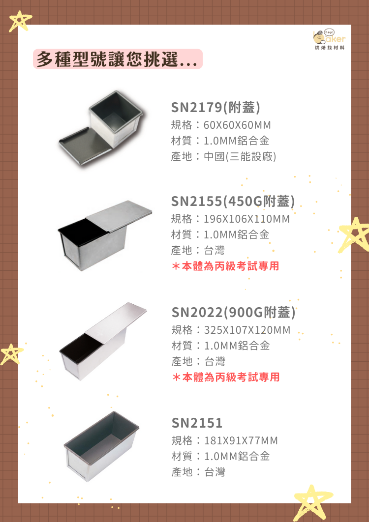 1.0mm的鋁合金材質吐司模(多種型號),不易變形,堅固更耐用!導熱迅速、均勻,烘焙成品烤色美。