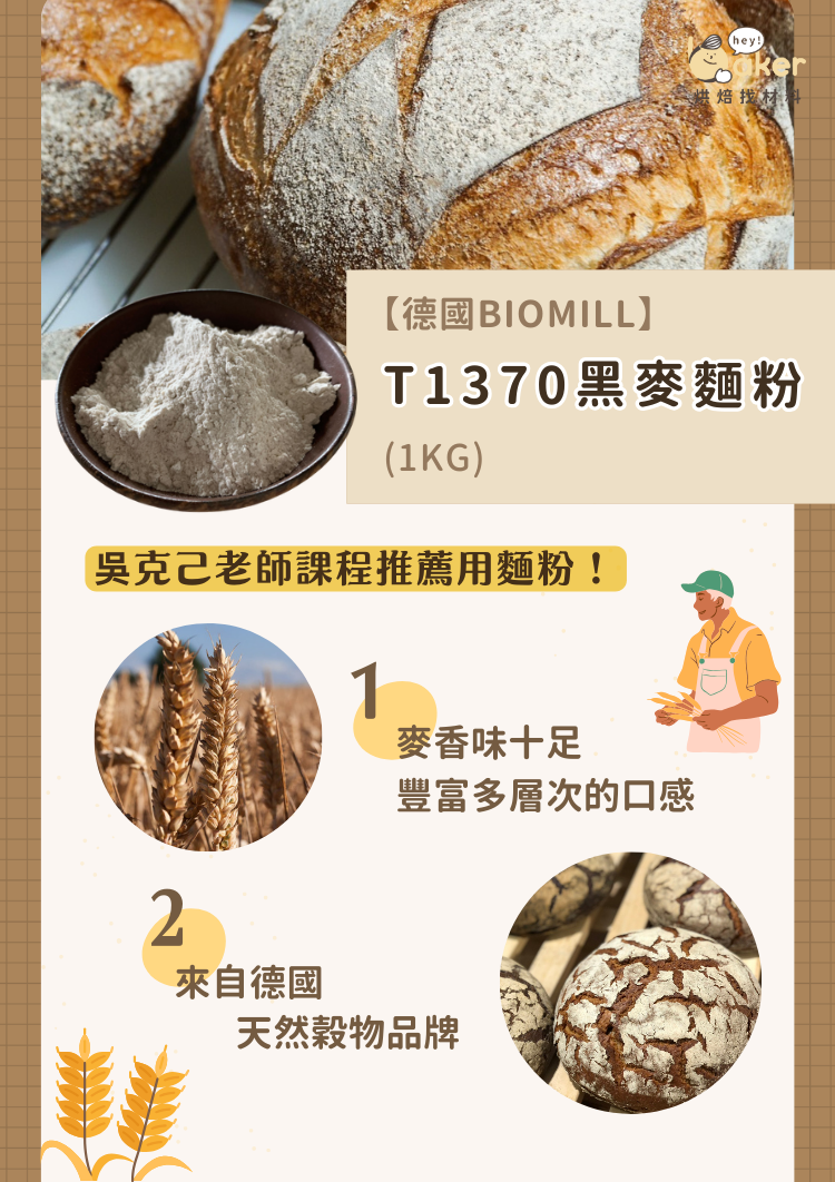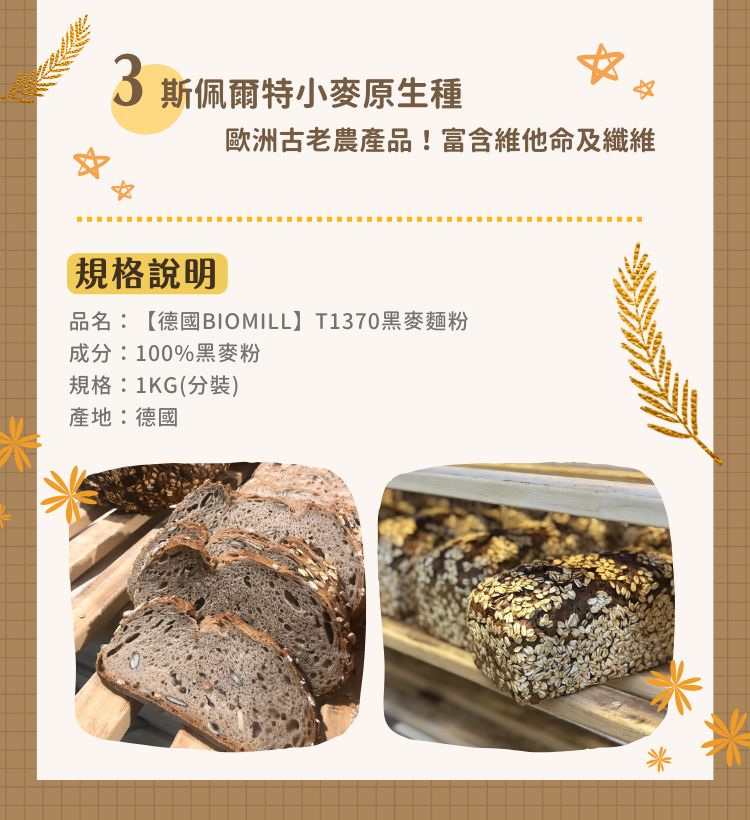 烘焙職人吳克己老師推薦麵粉,來自德國的天然品牌,為斯佩爾特小麥原生種,超過五千年歷史~麥香風味十足,口感豐富多層次,每一口都吃得到黑麥的獨特風味!
