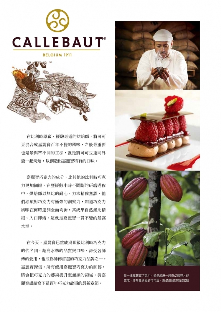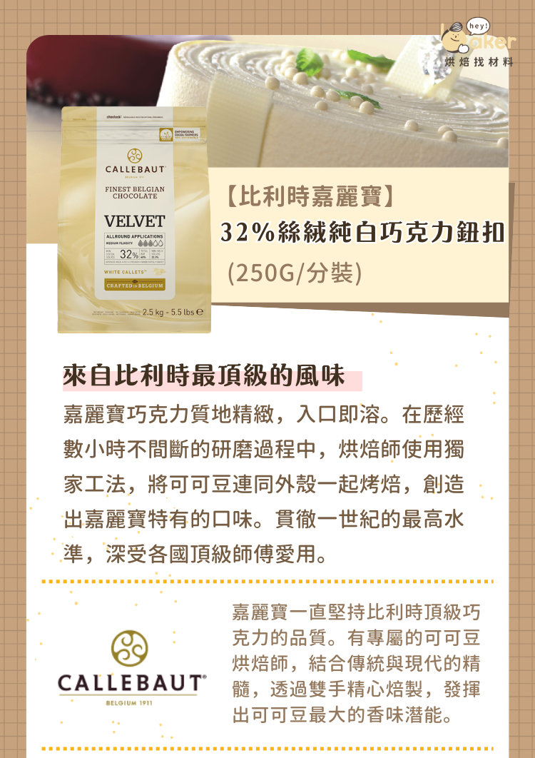 來自比利時的頂級巧克力品牌-嘉麗寶,32%絲絨純白巧克力鈕扣適合製作各式西點、調溫。