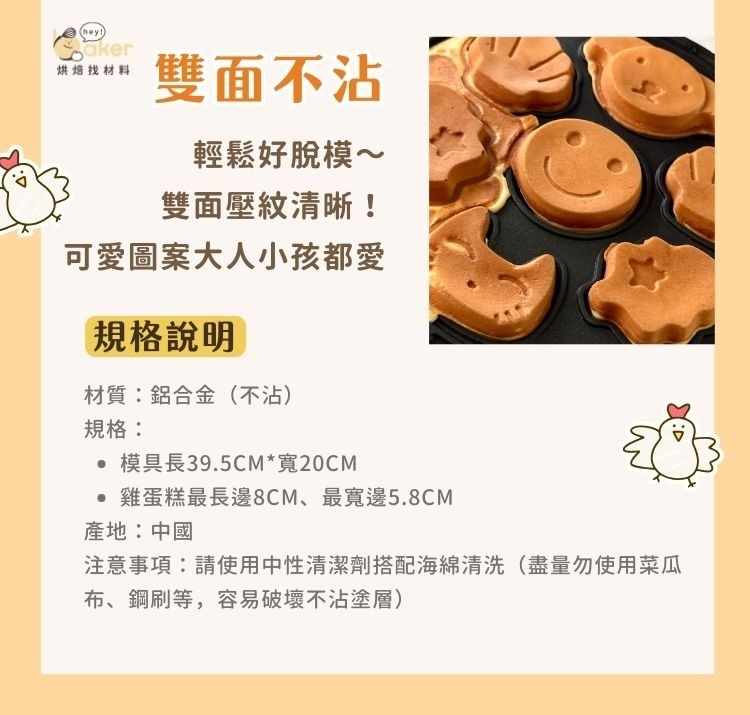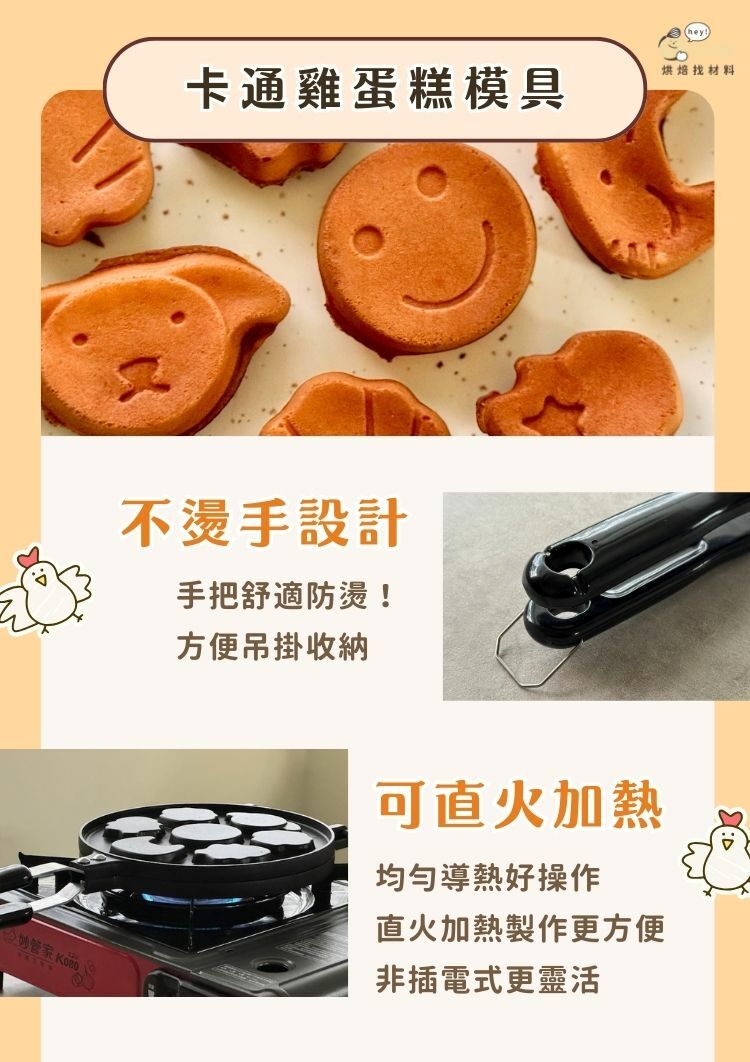 可愛卡通雞蛋糕圖案,簡單做出夜市雞蛋糕!高質感手把使用可輕鬆翻轉90度,直火使用加熱更均勻~比起一般插電式設計更靈活!不沾黏模具脫膜更輕鬆、成型更美觀!不論是大人或小孩都愛不釋手,麵糊加滿一點還可以做出整片的雞蛋糕,趕快動手來做吧!!!