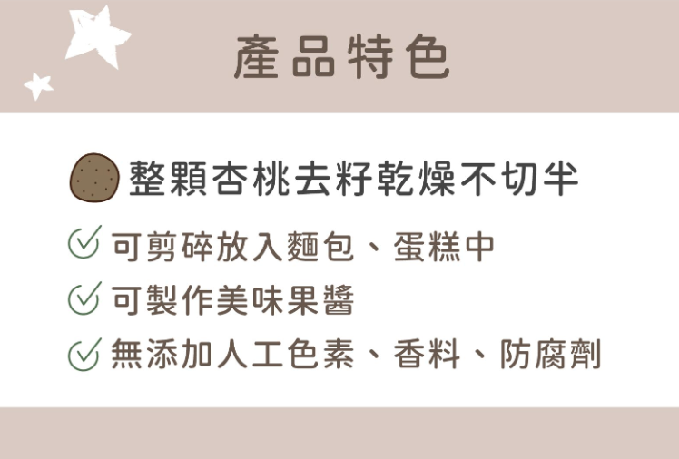整顆杏桃去籽乾燥不切半,可剪碎放入麵包、蛋糕、奶油內餡,製作果醬、杏桃抹醬,直接當零嘴。無添加人工色素、香料、防腐劑。