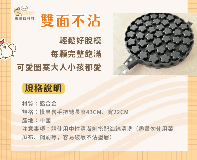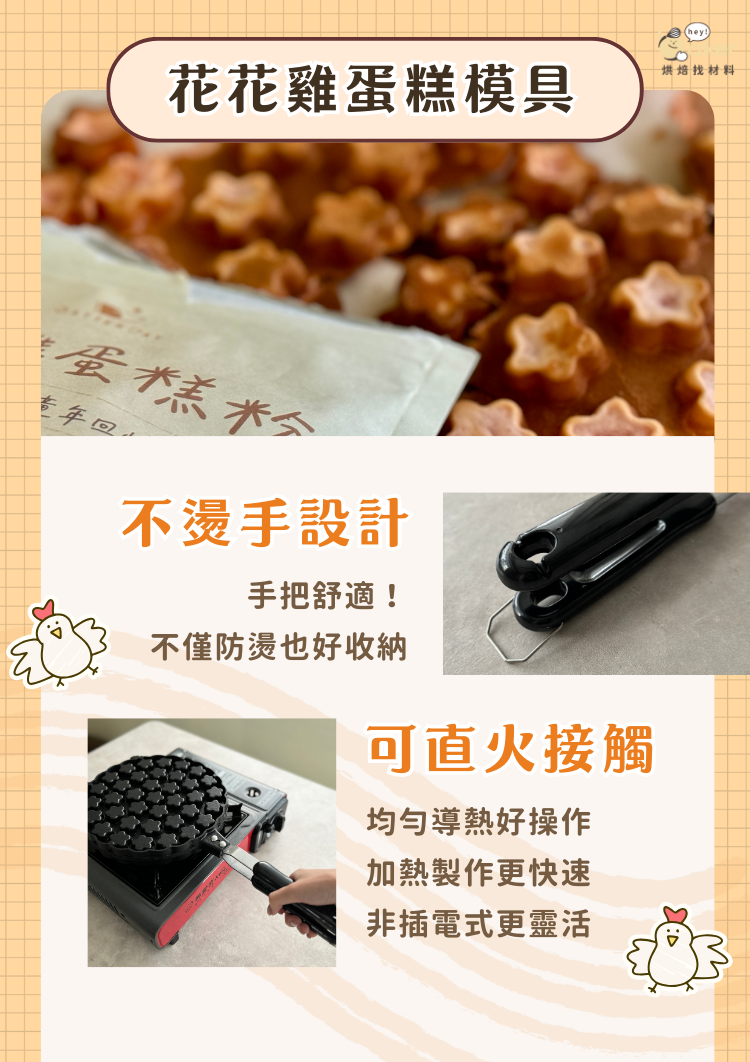 美麗的滿天星雞蛋糕圖案,最有氣質的雞蛋糕!高質感手把使用可輕鬆翻轉90度,可直火使用加熱更均勻~比起一般插電式設計更靈活!不沾黏模具脫膜更輕鬆、成型更美觀!不論是大人或小孩都愛的夜市小吃,趕快動手來做吧!!!