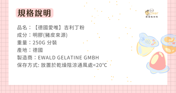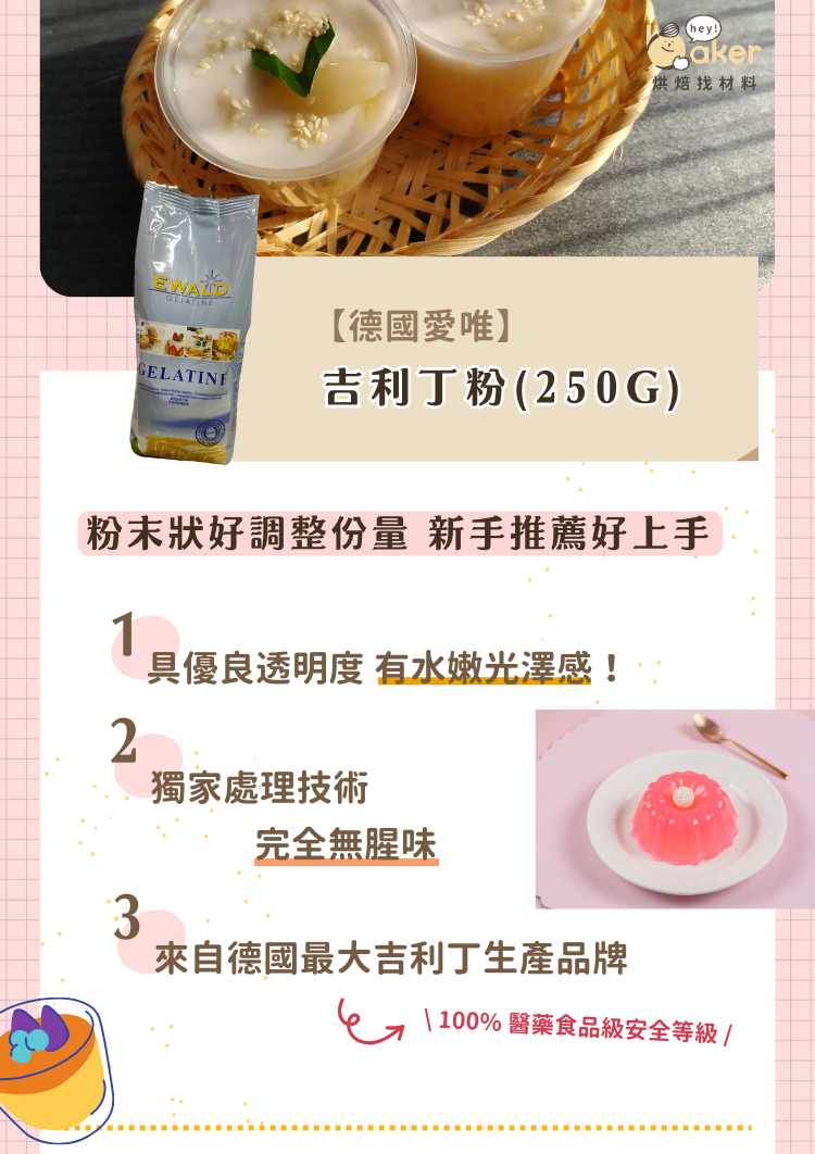 德國愛唯是在地知名的吉利丁品牌,100%醫藥食品安全等級,品質保證吃了更安心!粉末狀好調整份量,新手超推薦。凝膠力強、透明度高具有水嫩光澤感、獨家技術完全無腥味!是烘焙人購買吉利丁粉的最佳選擇~