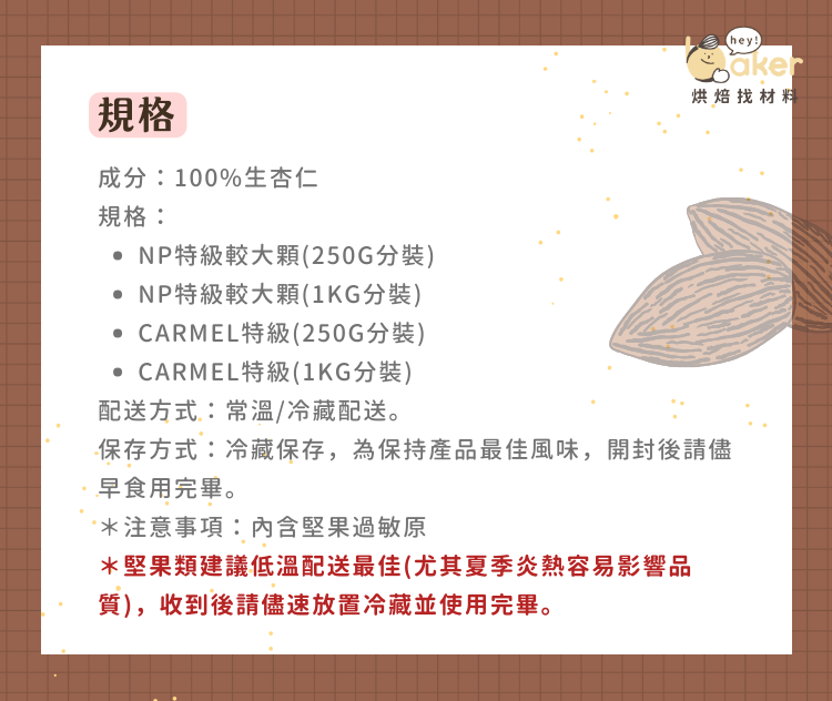 *堅果類建議低溫配送最佳(尤其夏季炎熱容易影響品質),收到後請儘速放置冷藏並使用完畢。