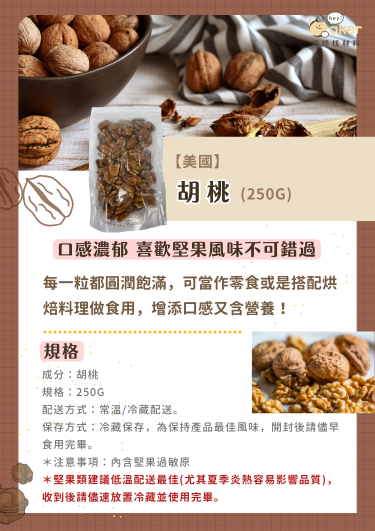 喜歡堅果風味的人絕對不能錯過,胡桃口感濃郁,無論是大人還是小孩都推薦。胡桃不僅營養價值高,而且可以多種用途,例如加入烘焙、優格或沙拉中,展現其多樣化的美味魅力。