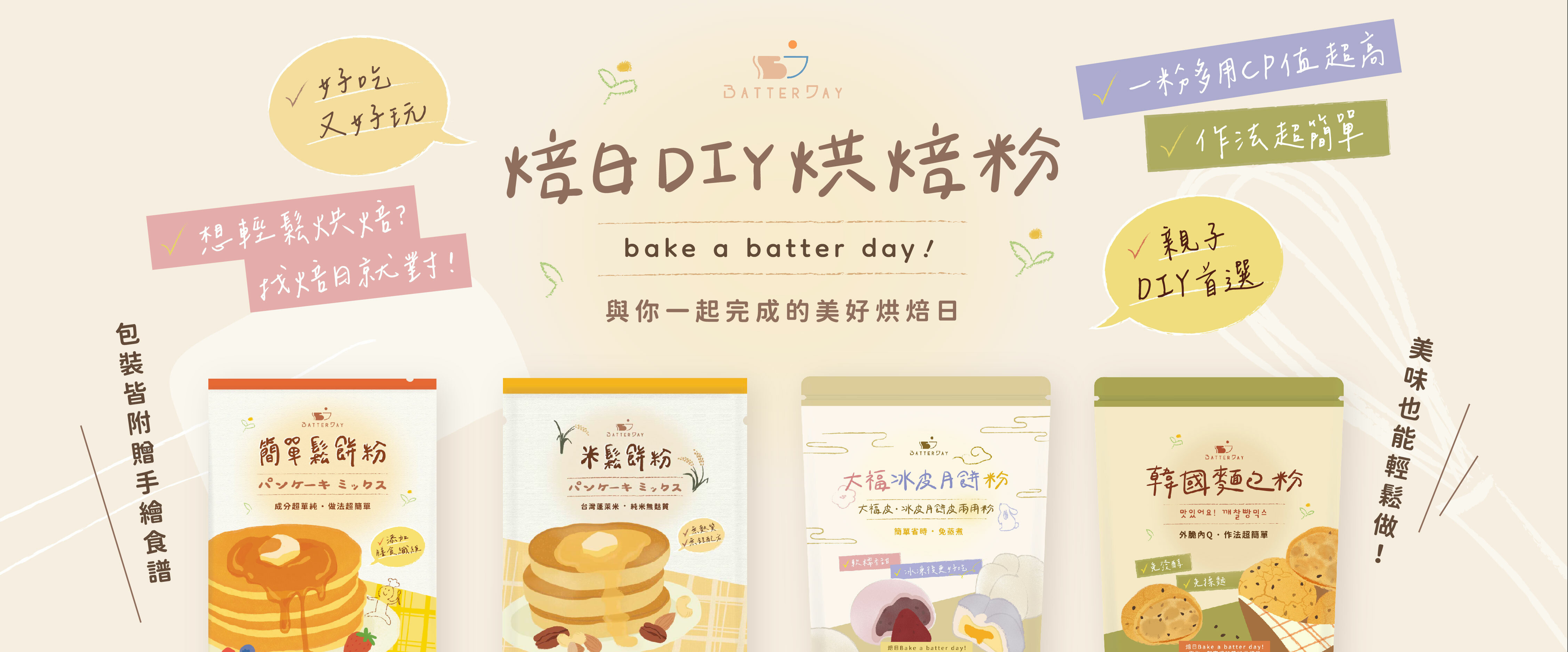焙日Bake a batter day! 與你一起完成的美好烘焙日。提供為烘焙人著想的高品質食材、器具物品。多點巧思,讓烘焙日過得聰明、便利和美好!