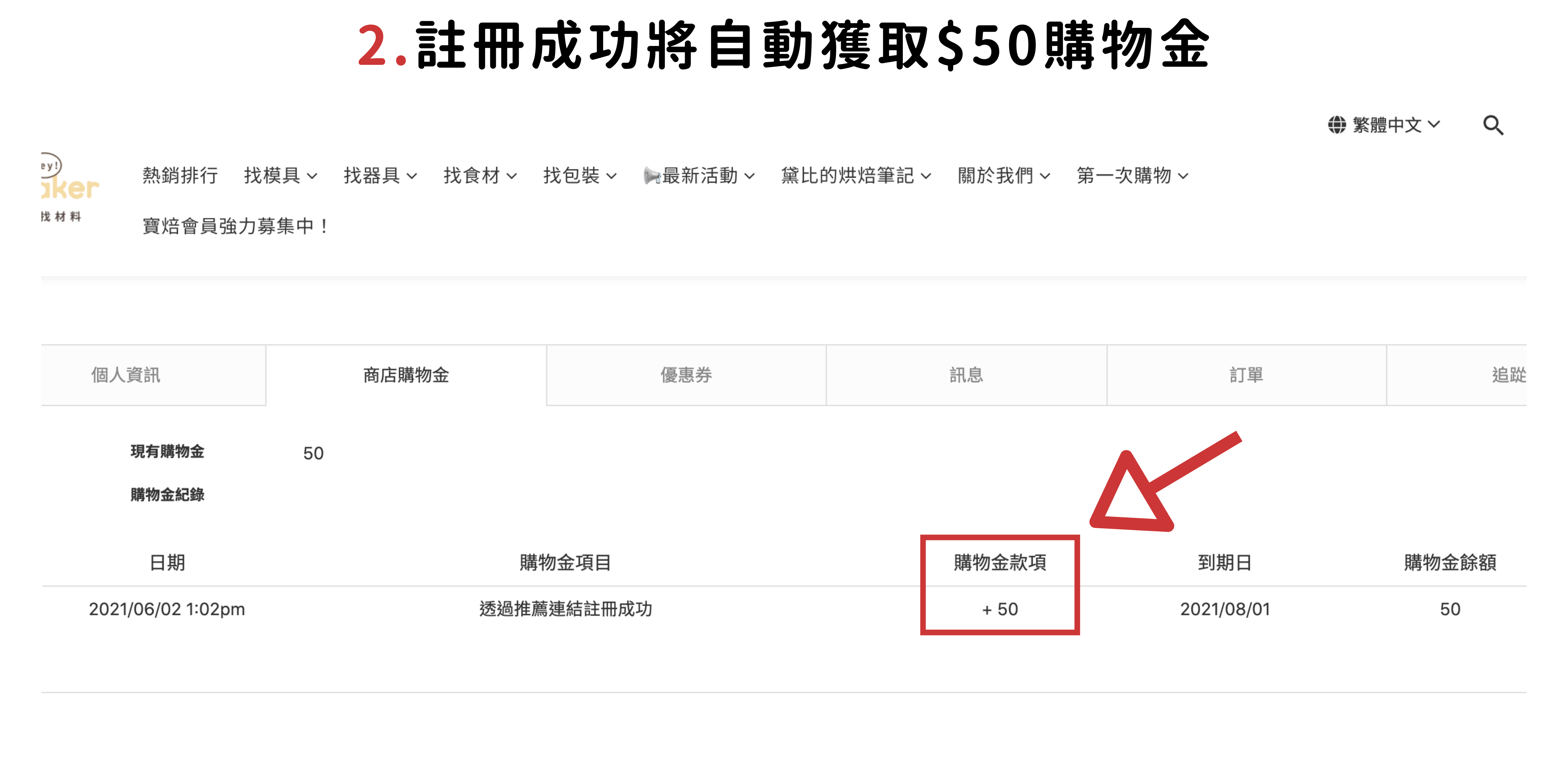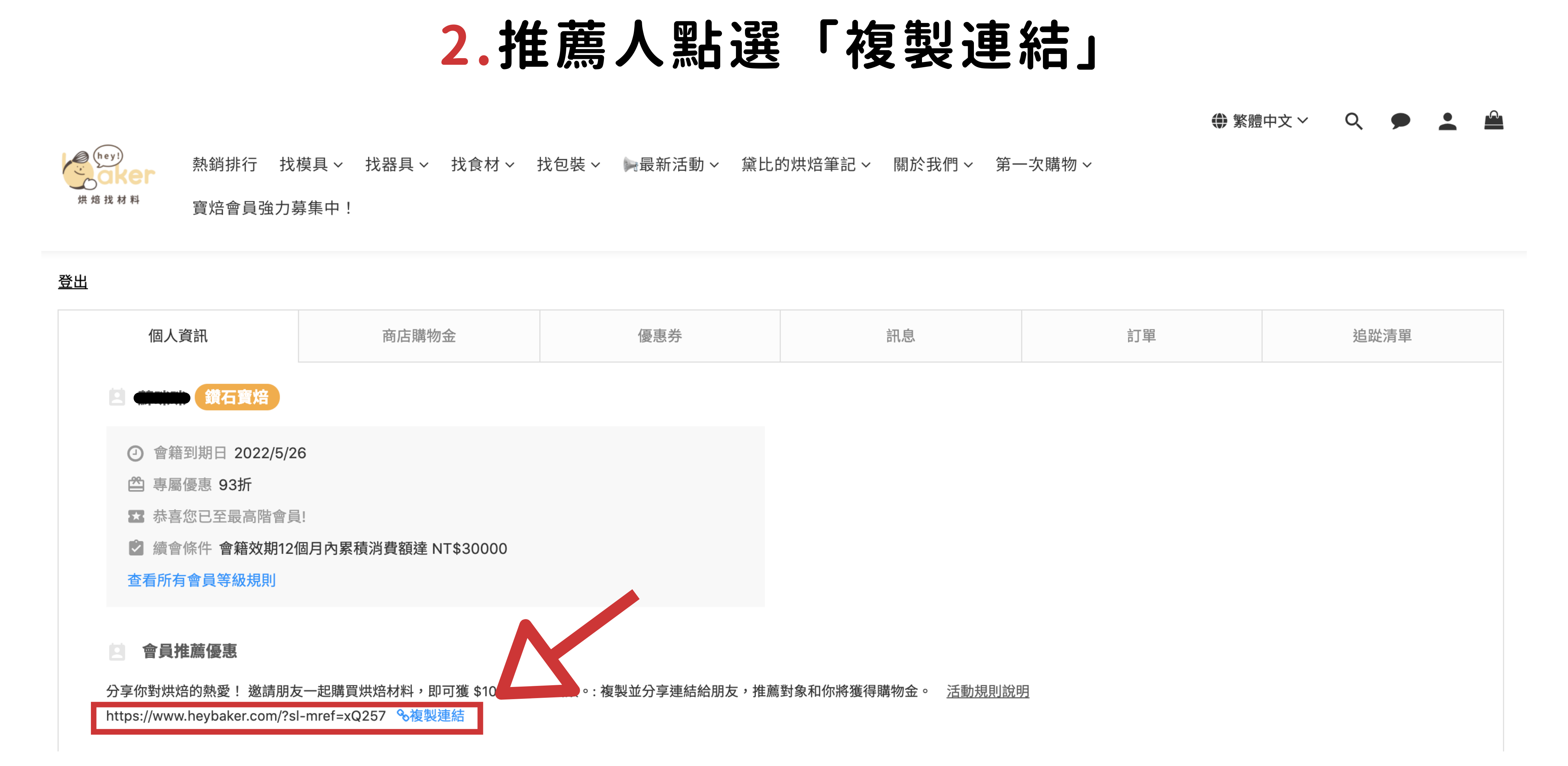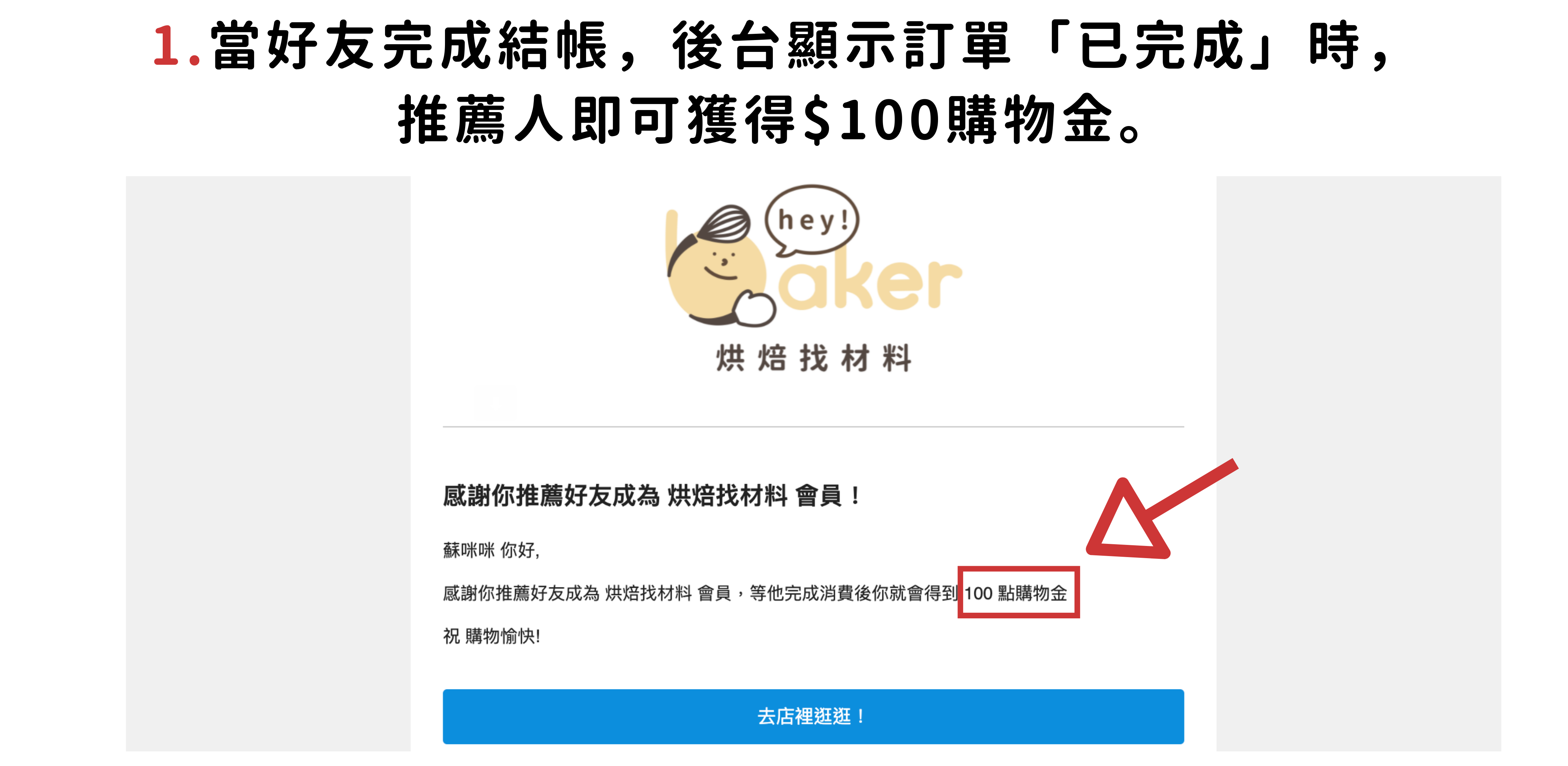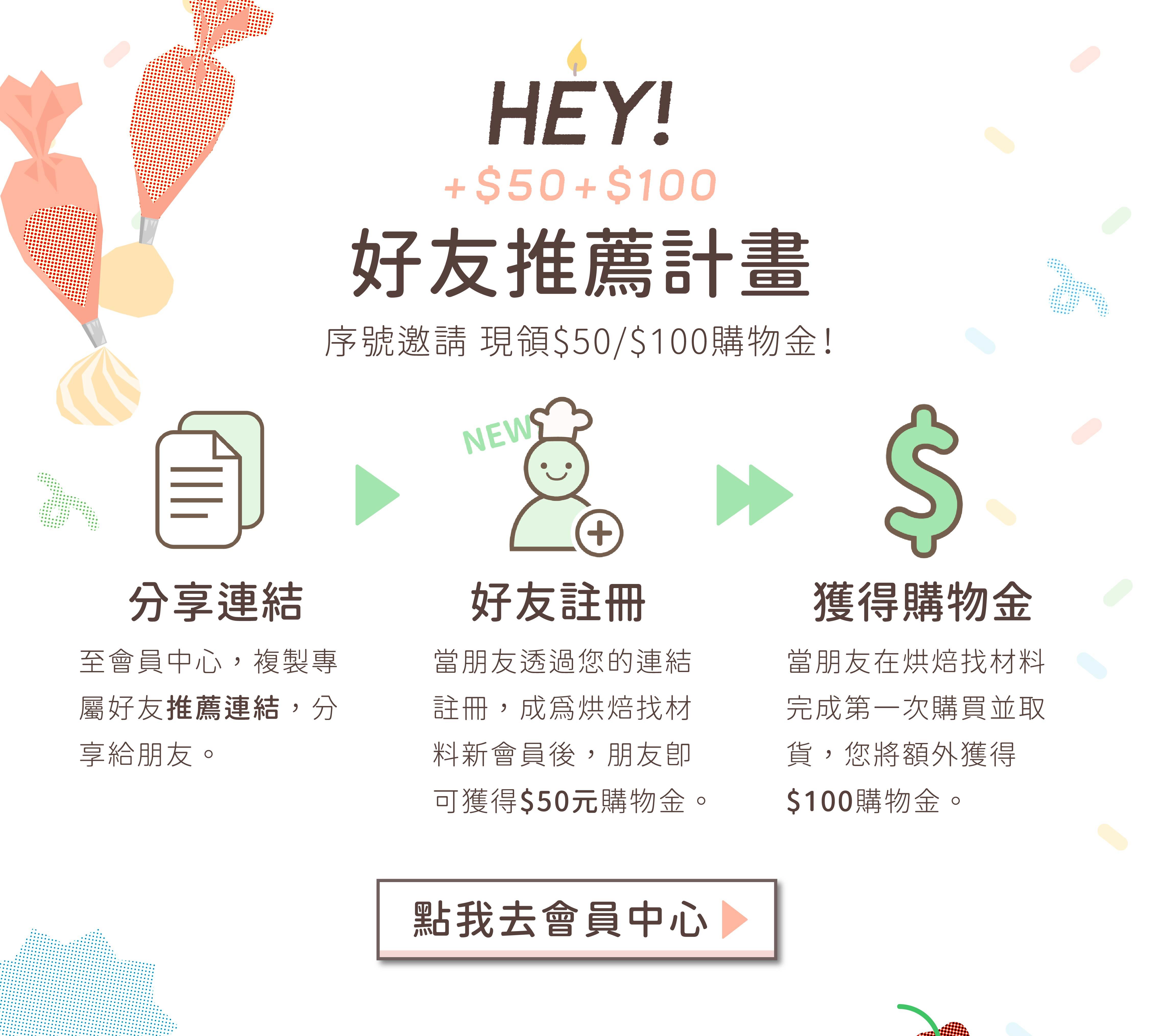 凡是烘焙找材料會員,將個人專屬連結分享給朋友,朋友點擊專屬連結註冊且完成訂單後就會獲得$100購物金,使用期限為30天。
