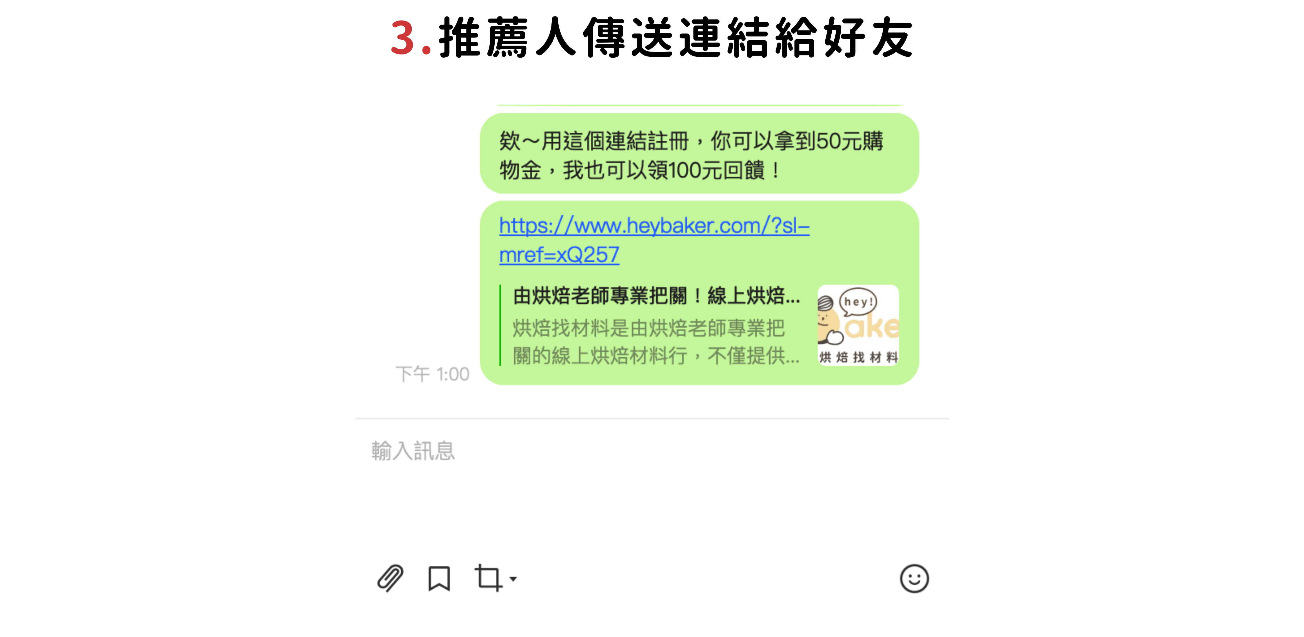 邀請朋友加入烘焙找材料,朋友註冊新會員將額外獲得 $50 元購物金,結帳可折抵消費金額。當朋友完成首次購買,我們也將回饋 $100 購物金作為感謝,回饋不限數量!只要 3 步驟,一起邀請朋友加入烘焙旅程吧!