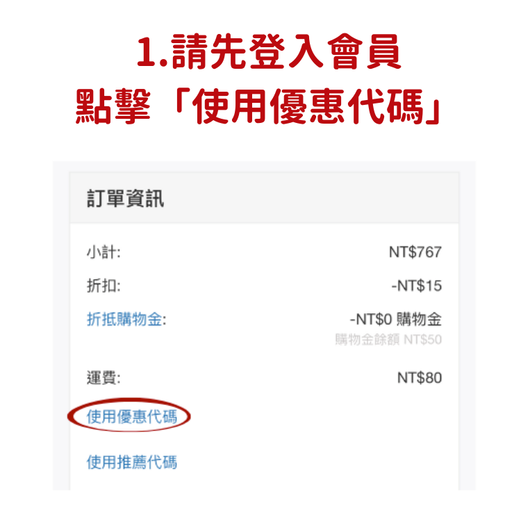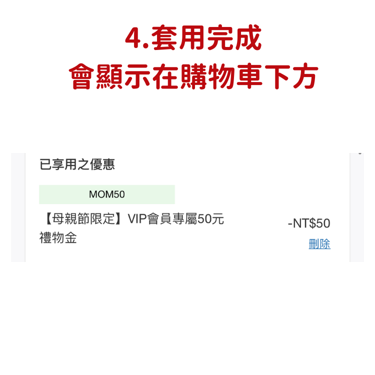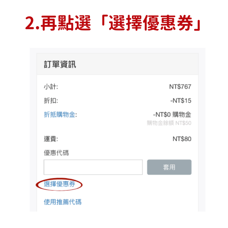 結帳時點選優惠券即可成功折抵,請參考以下步驟: