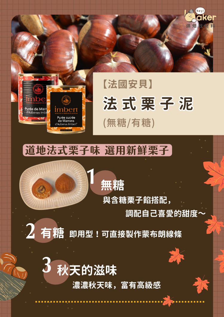 法國安貝Imbert®頂級栗子製品品牌,與天然波本香草棒烹煮,保有栗子原色及香氣濃郁,秋季甜點風味首選~