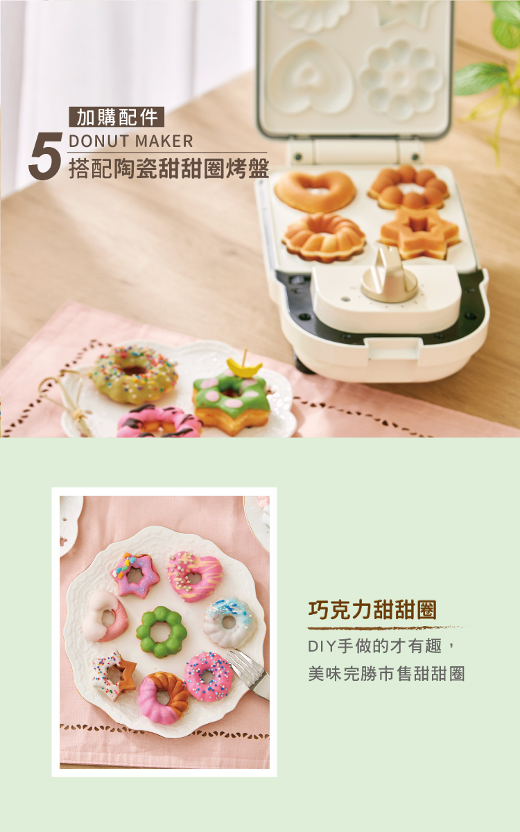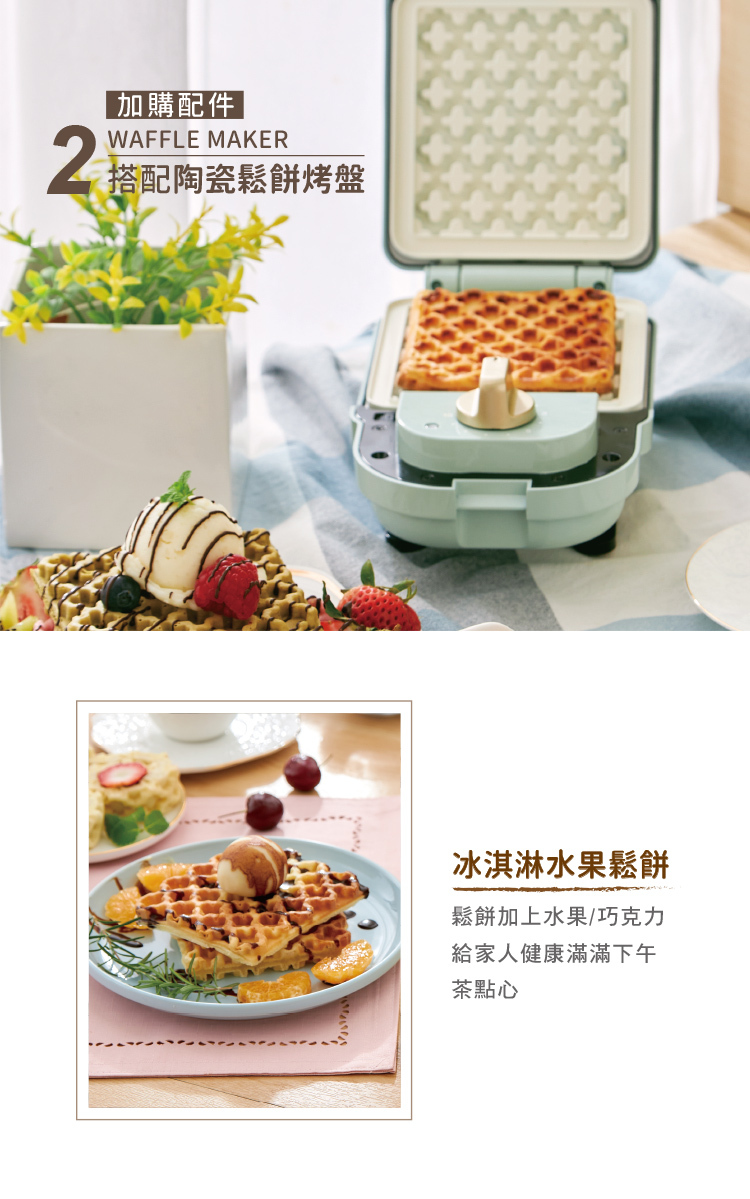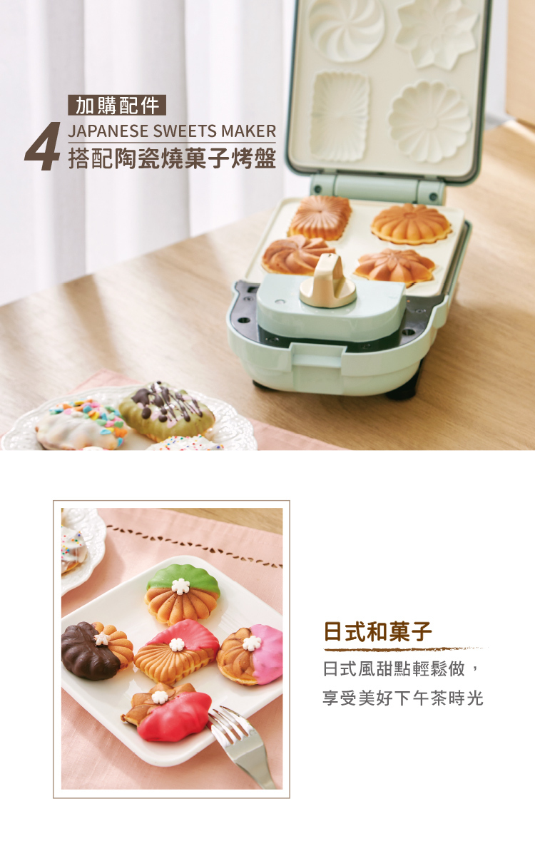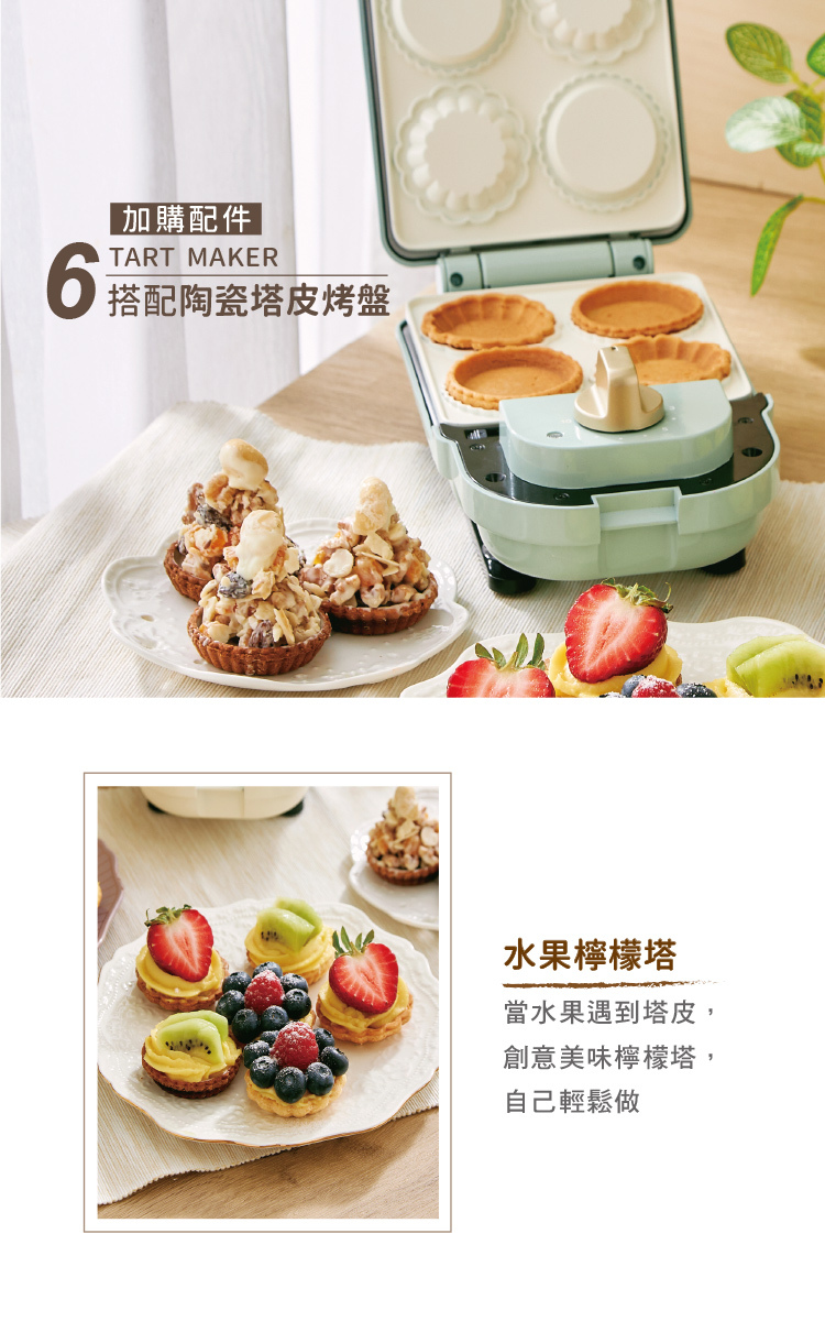 2. 主機(薄荷綠CY-1625 / 奶油白CY-1622)+5入烤盤套組(鯛魚燒烤盤+鬆餅烤盤+塔皮烤盤+甜甜圈烤盤+燒菓子烤盤):團購價3,480(原價$6,230)