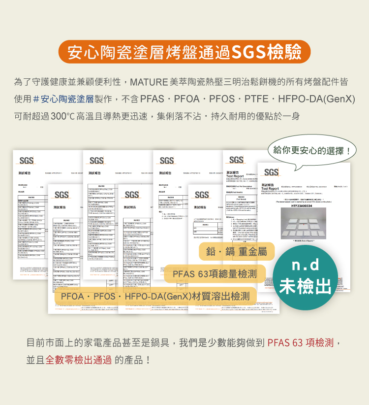 目前市面上的家電產品甚至是鍋具,我們是少數能夠做到 PFAS 63 項檢測,並且全數零檢出通過的產品!