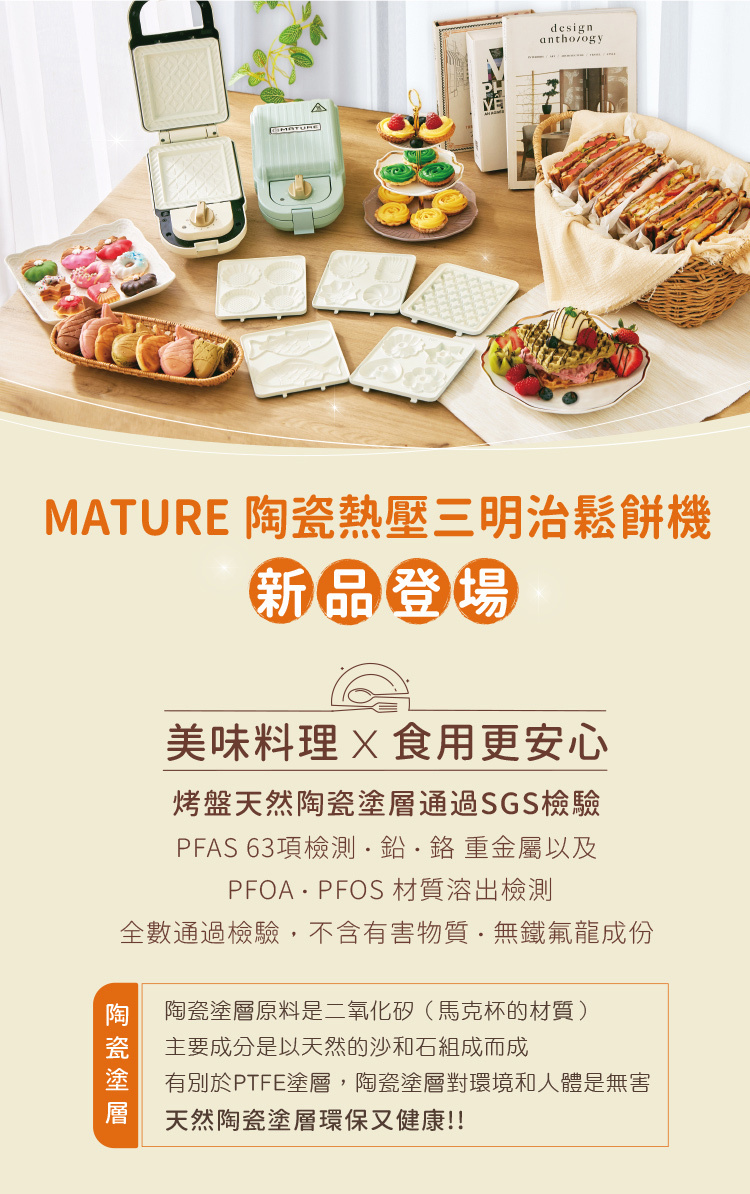 𝙈𝘼𝙏𝙐𝙍𝙀 美萃陶瓷熱壓三明治鬆餅機的所有烤盤配件皆使用#安心陶瓷塗層製作,不含 PFAS、PFOA、PFOS、PTFE、HFPO-DA(GenX) 可耐超過 300℃ 高溫且導熱更迅速,集俐落不沾、持久耐用的優點於一身。