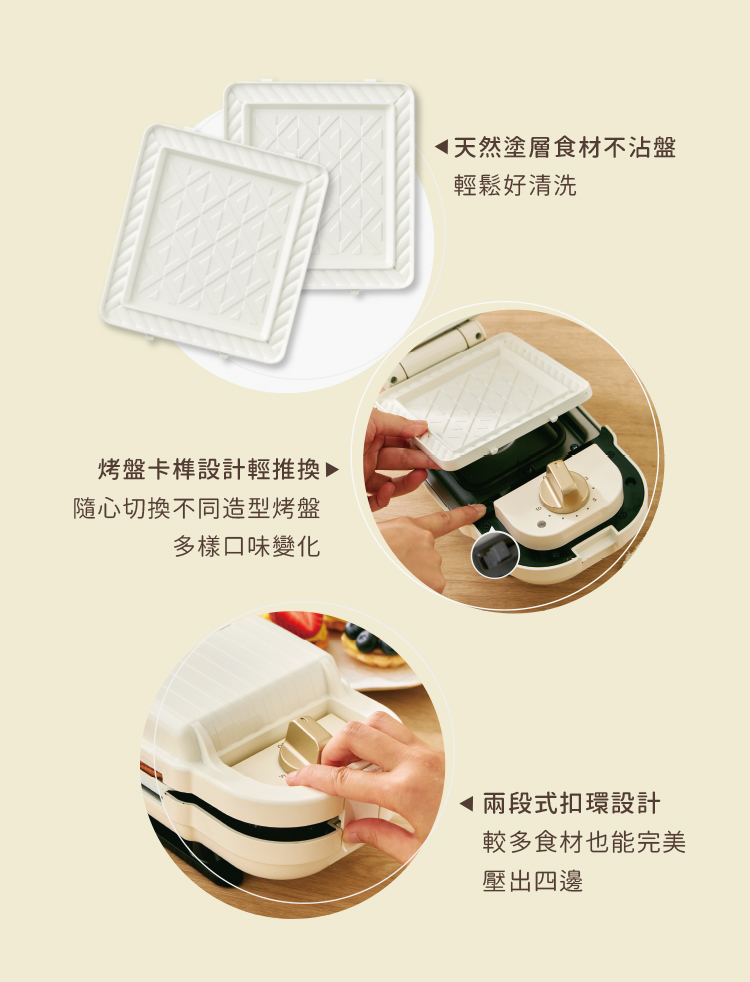 𝙈𝘼𝙏𝙐𝙍𝙀 美萃陶瓷熱壓三明治鬆餅機的烤盤配件採用鋁壓鑄材質,加上雙層奈米陶瓷塗料,進一步達到不沾與烤盤防護效果,享受美味更放心。
