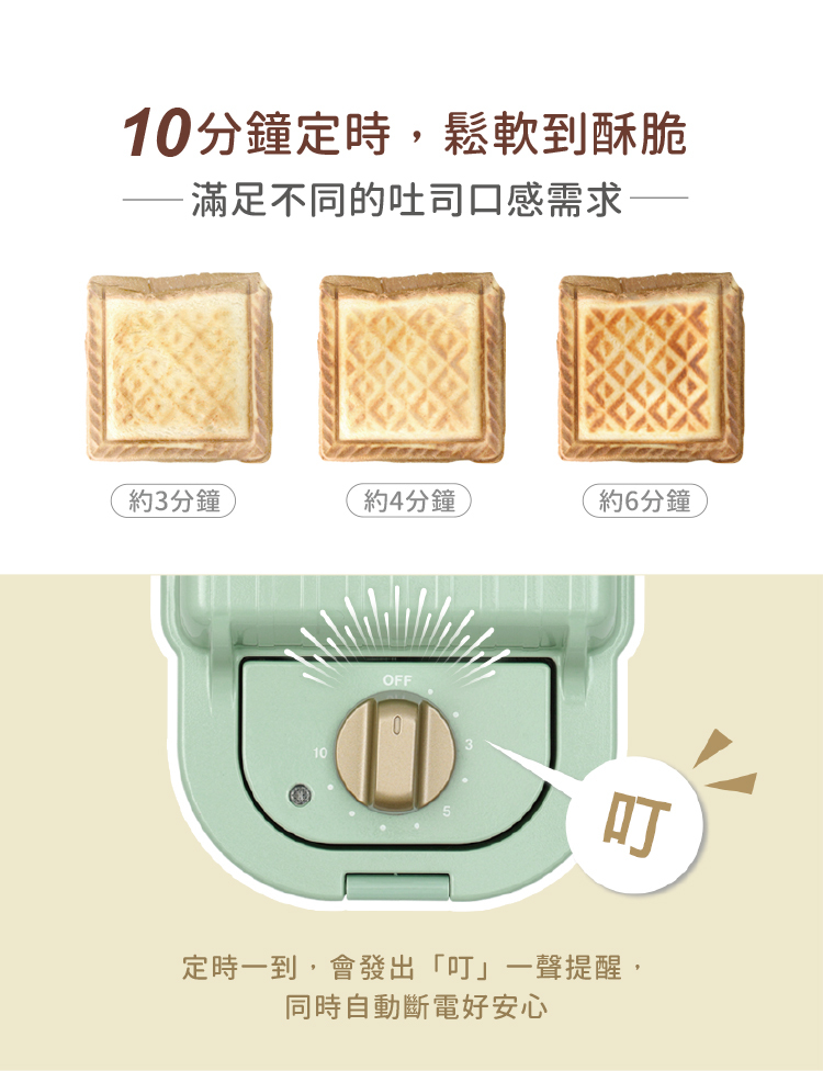 ✦ 10分鐘計時旋鈕,輕鬆熱壓不需顧火