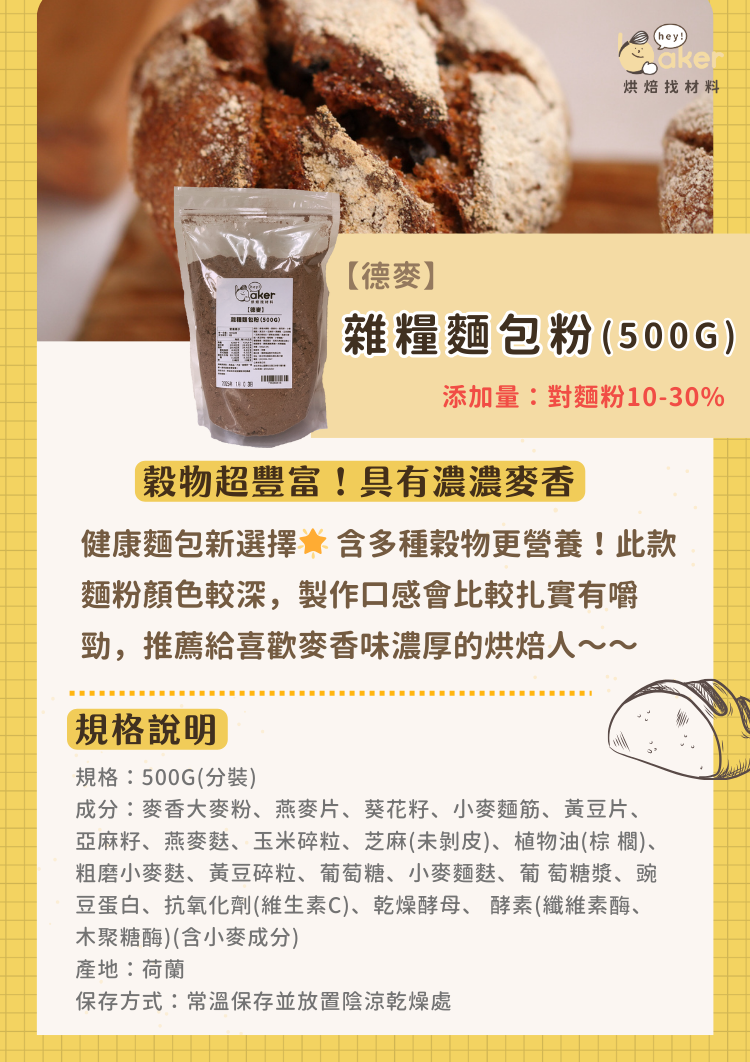 雜糧麵包粉內含的穀物豐富,散發濃濃的麥香味~是健康麵包的新選擇,營養價值高!其深色的外觀和濃厚的口感給人留下深刻的印象,口感富有嚼勁。這款雜糧麵包粉也很推薦加入許多堅果,像是:南瓜籽、核桃等堅果類搭配製作,絕對是不可錯過的麥香體驗喔!
