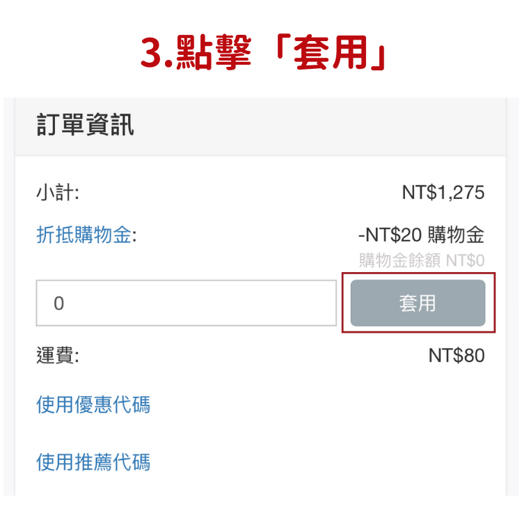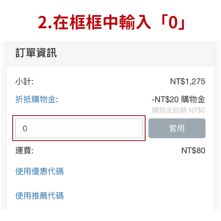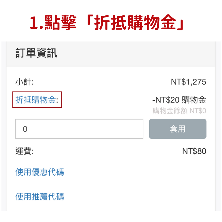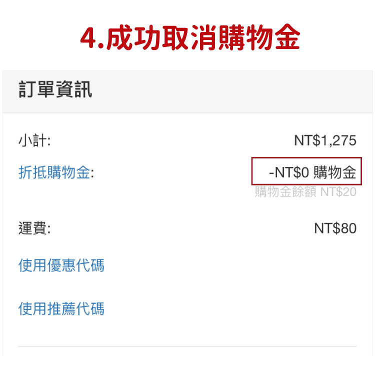 結帳時系統會自動套用可使用之購物金,若欲取消使用,請參考以下步驟: