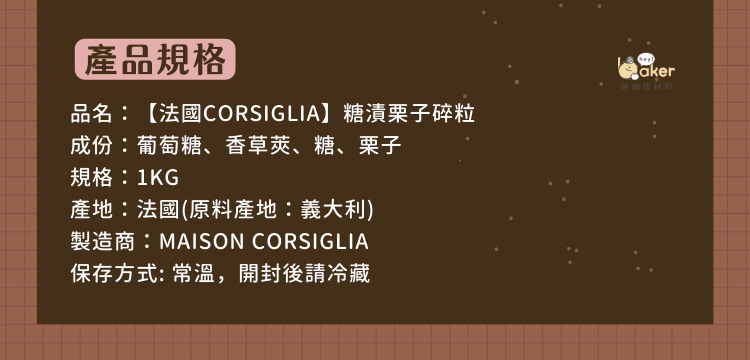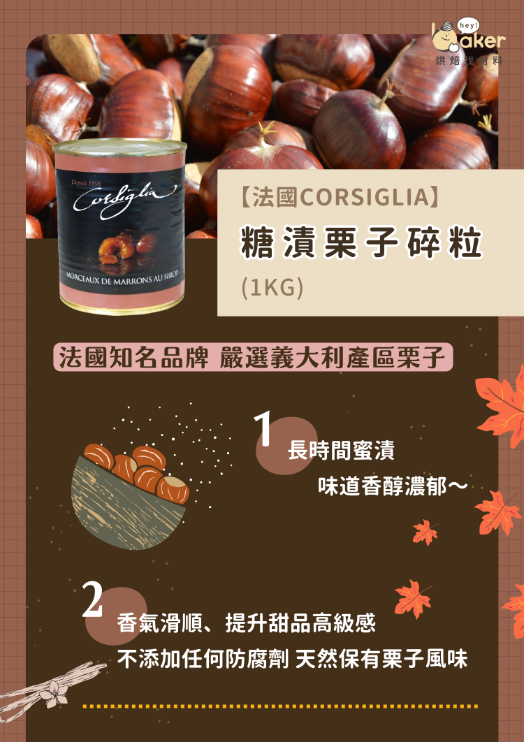 嚴選義大利產區栗子,經過長時間的糖漬讓每口栗子的味道香醇濃郁,栗子碎粒可用於甜點裝飾,不論是外表或是內餡都可以來一點,提升口感之餘來嚐點最道地的栗子風味吧!Corsiglia為法國代表性品牌,已經擁有120年的歷史,絕對不可以錯過!