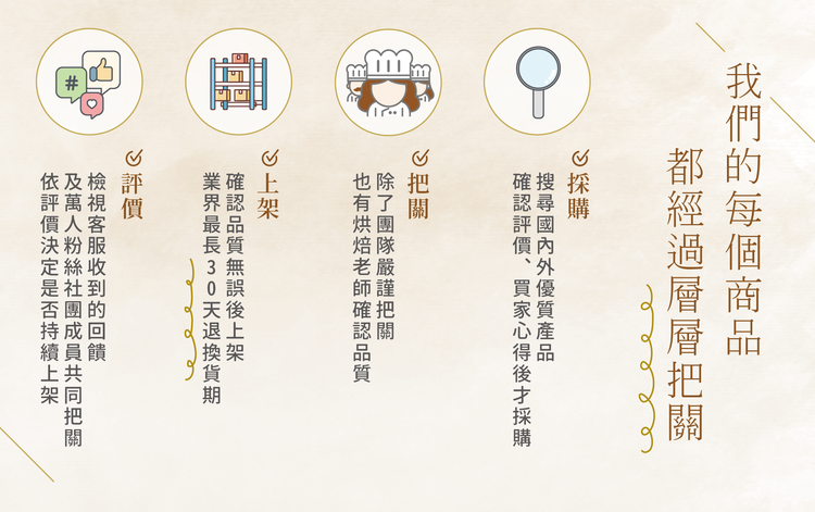 烘焙找材料的商品,皆是經過團隊內數位烘焙老師三階段的挑選與試用,加上四萬名的烘焙愛好者共同測試,請安心選購。