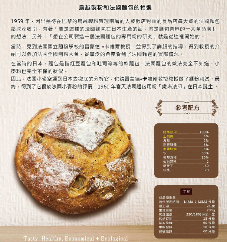 全日本最早開發的法國麵包專用粉,是現今最高品質道地的法國麵包粉。能製作擁有香甜甘味、濕潤化口的特性,口感酥脆香純的歐法式麵包。適合法國麵包、歐式麵包、丹麥麵包、派皮等品項。