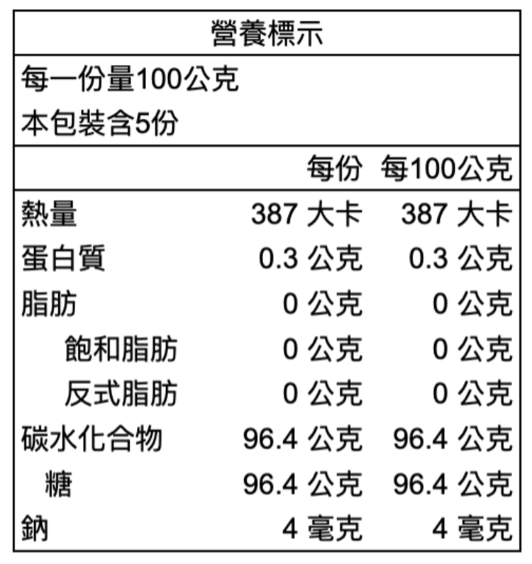 備註:與其他有花生、堅果、大豆、麩質、芝麻的產品於同一分裝廠生產,食物過敏者請留意。